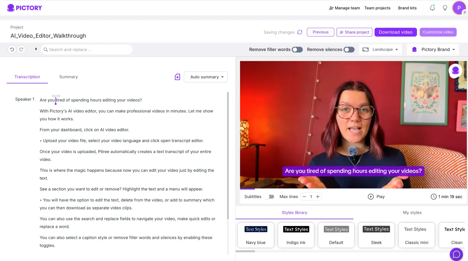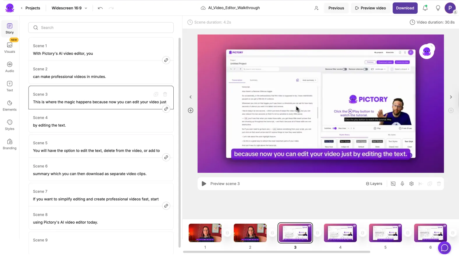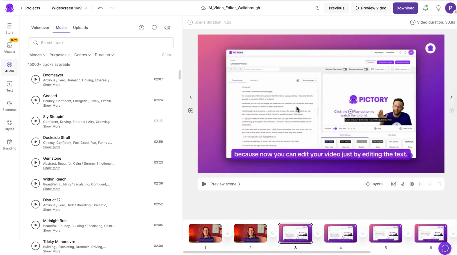 Pictory uses AI to analyze your transcript and identify key points, phrases, or sections of interest.