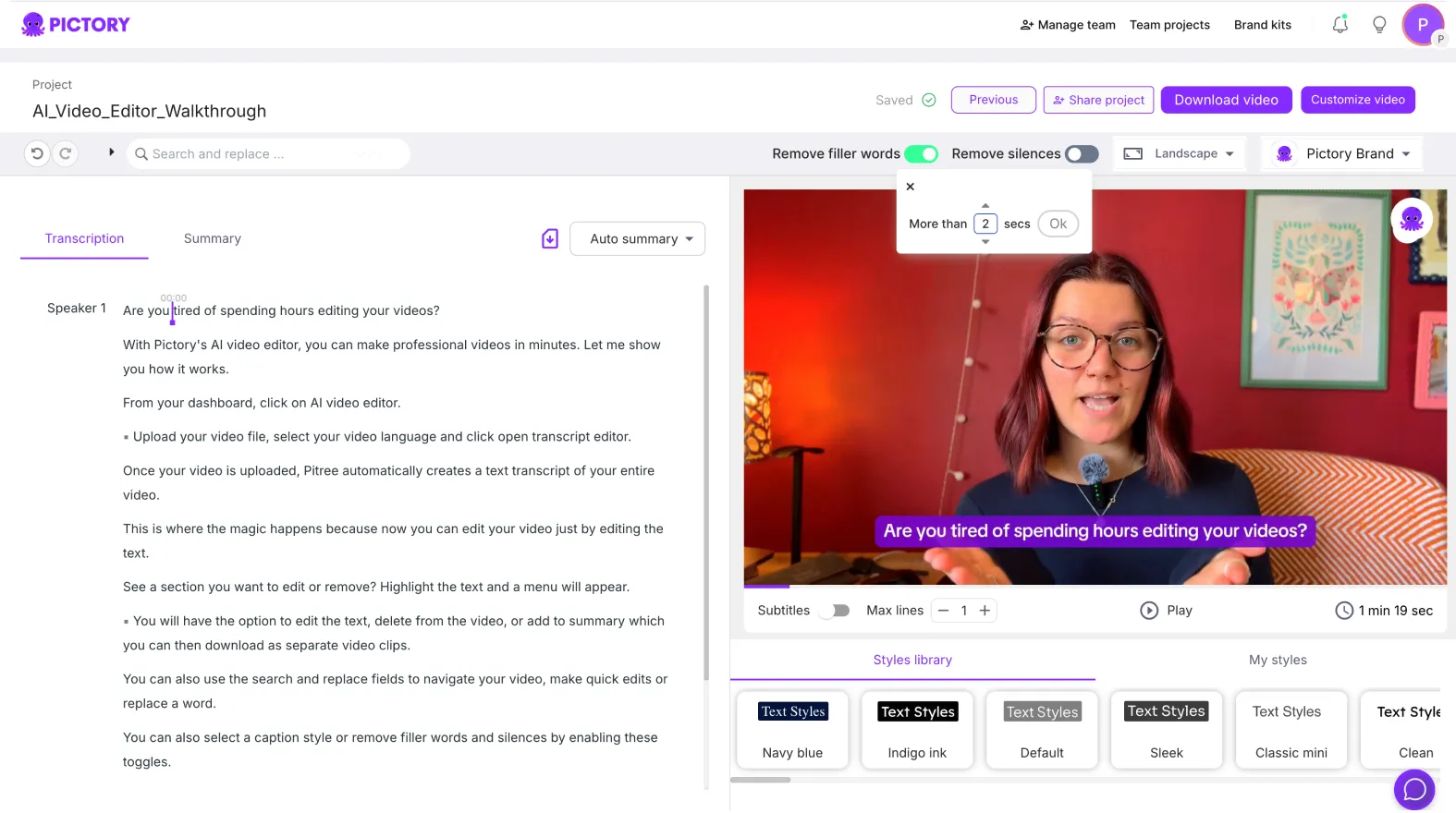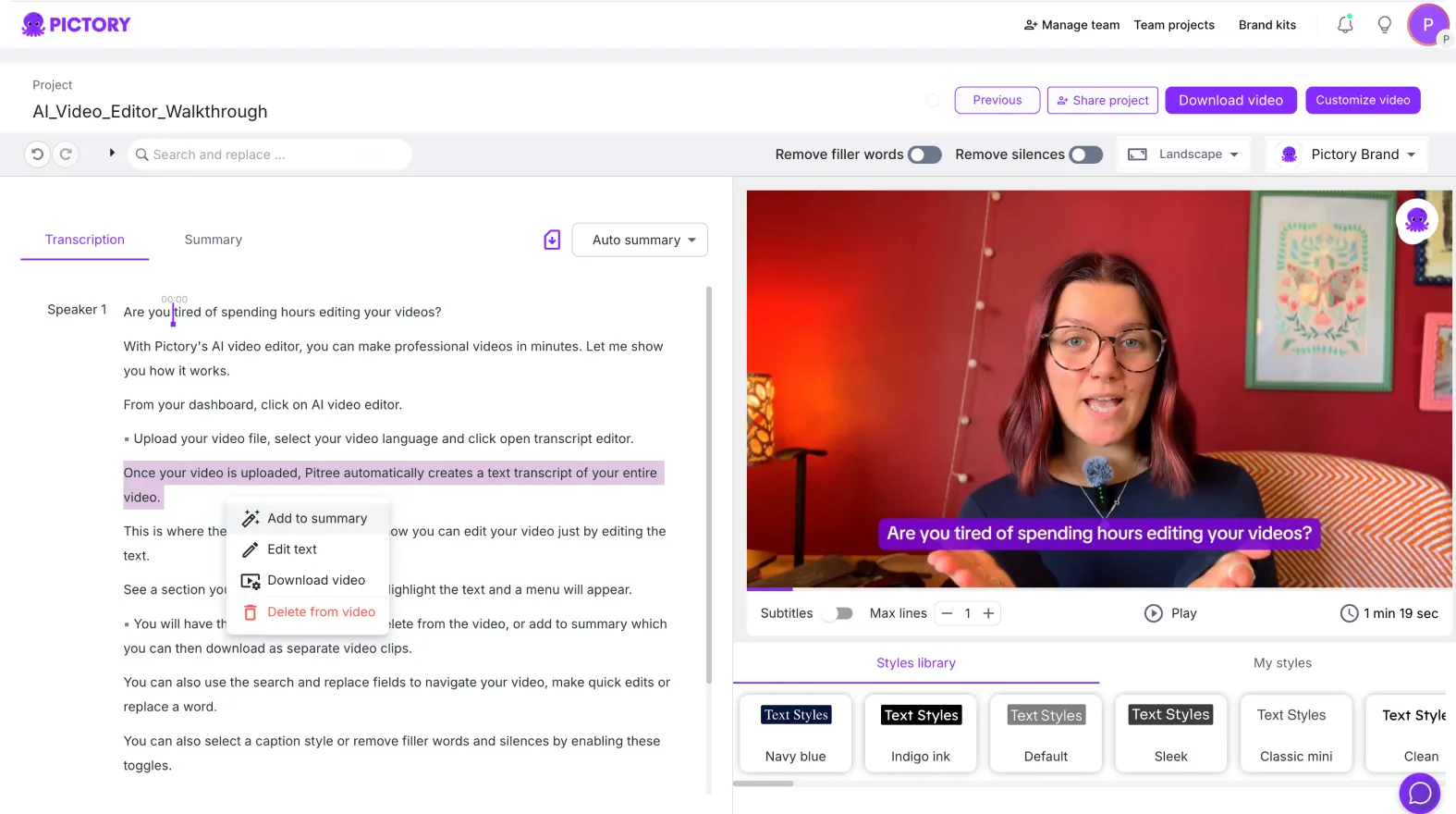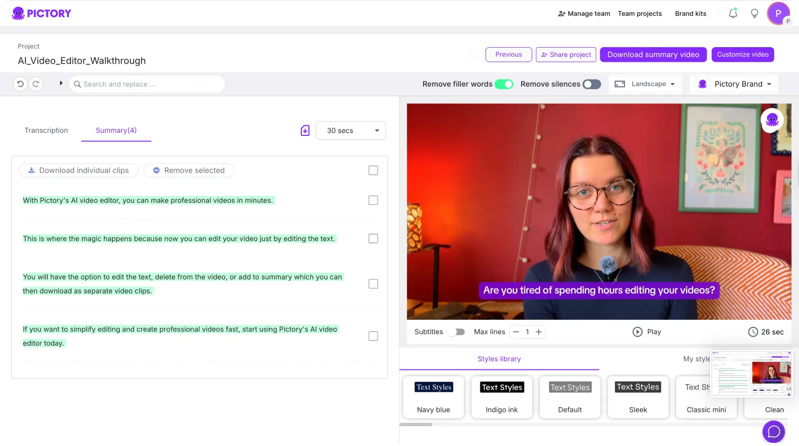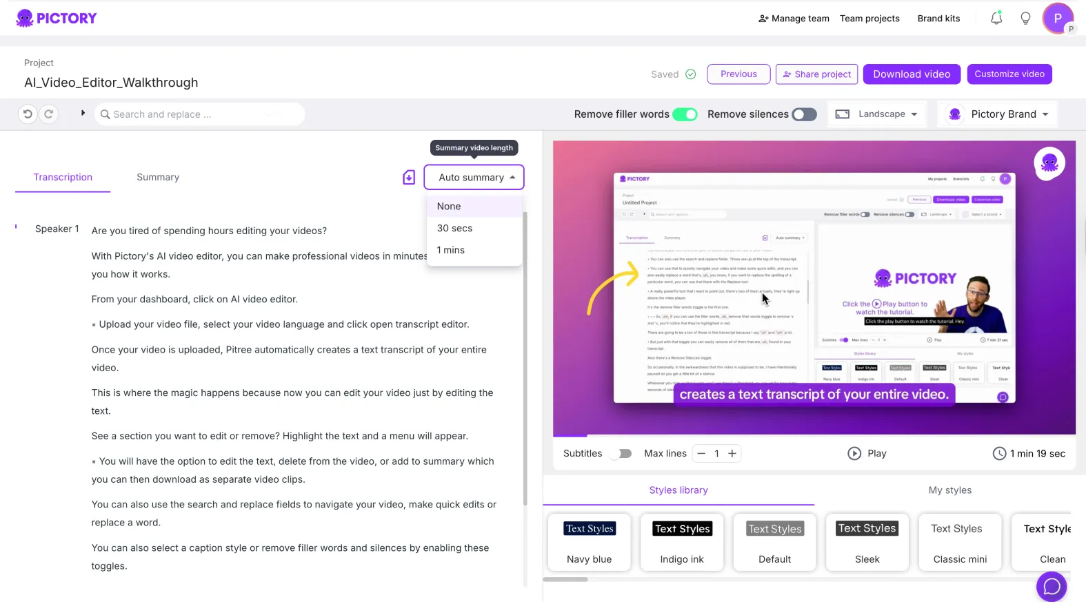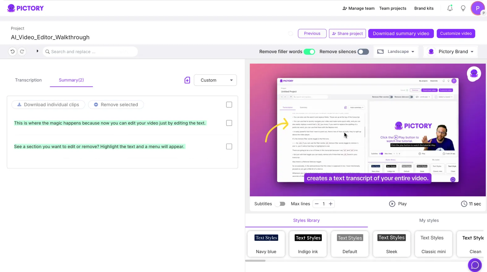 Pictory’s AI identifies key moments and phrases that are most relevant to your topic or keywords. You can: