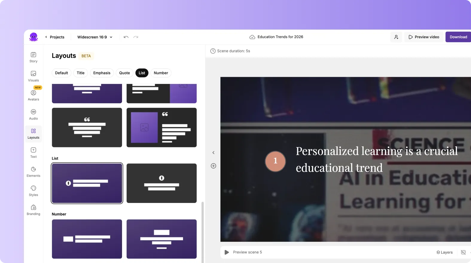 - Create videos from text, audio, URLs, or PowerPoint