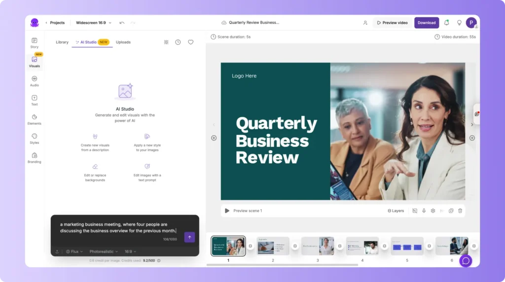 Pictory’s AI Studio allows you to generate AI images and videos from text prompts directly inside the Pictory video editor. Instead of switching between different platforms, AI Studio gives you generative capabilities inside your video workflow.