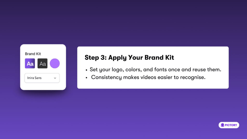 Consistency builds trust, especially for internal teams and customers. Pictory Brand Kits allow you to apply your visual identity once and reuse it across every training video.