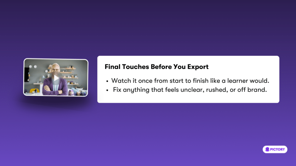 This checklist is designed specifically for instructional and training content. It prioritizes clarity, consistency, and accessibility while leveraging Pictory AI automation to save time.