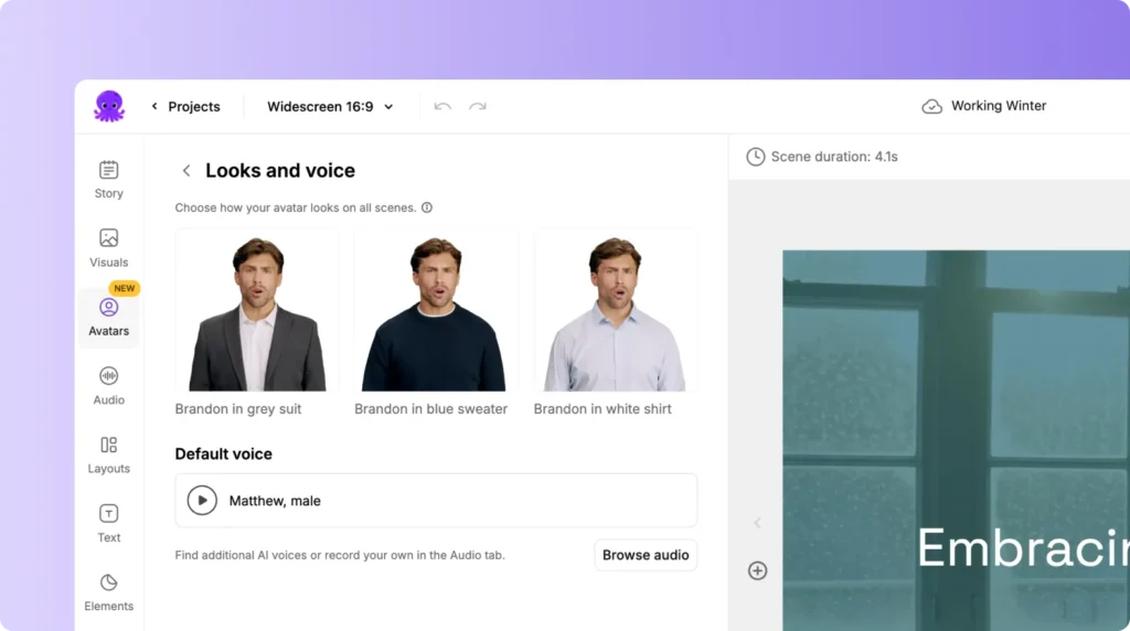 Each avatar is paired with an AI voice that automatically narrates the text in your scenes. Lip syncing is generated automatically when the video is exported.